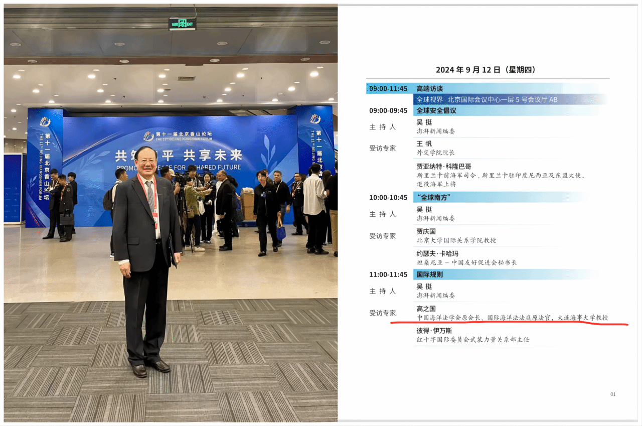 中国海洋法学会原会长、国际海洋法法庭原法官、大连海事大学高之国教授受邀参加第十一届北京香山论坛并在“高端访谈:全球视界”以“国际规则”为主题的访谈中,与红十字国际委员会武装力量关系部主任彼得·伊万斯共同讨论了在地区冲突和安全问题中,国际规则的重要性以及面临的挑战。