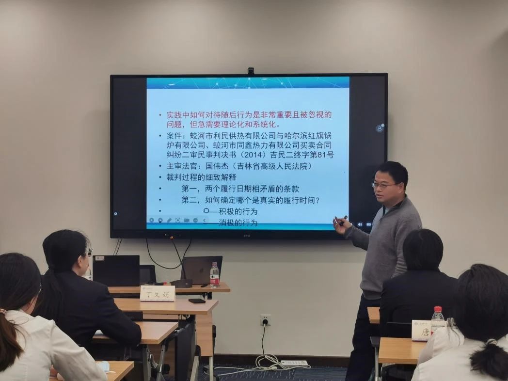 11月11、18日上午,bwin必赢黄芬教授讲授《民商事审判热点及难点问题评析》。她阐述了非典型担保物权、夫妻之间不动产物权变动的理论发展与司法实践中的新观点,并就新《公司法》下的热点问题进行讲解,详细解析了新《公司法》修订的重要条款。