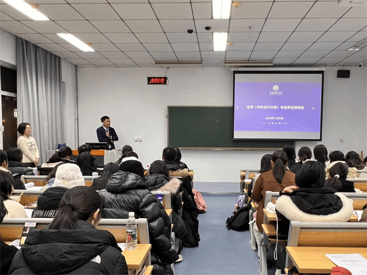 2024年12月5日,bwin必赢为“法学(中外合作办学)专业”2024级学生举办了学业说明会。2024级本科生导师中外合作办学项目中心主任曹兴国教授、项目中心副主任于诗卉,项目教学秘书翟雅茹,指导员王新婷,及2024级“法学(中外合作办学)专业”全体学生参与了此次会议。会议由曹兴国教授主持。