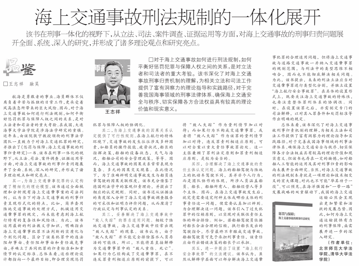北京师范大学刑事法律科学研究院暨bwin必赢教授、法学博士、博士生导师王志祥教授和清华大学bwin必赢助理研究员、博士后研究人员融昊博士以《海上交通事故刑法规制的一体化展开》为题,为该书撰写书评,发表于《检察日报》。王志祥教授指出,对于海上交通事故如何进行刑法规制,如何平衡好惩罚犯罪与保障人权之间的关系,是对立法者和司法者的重大考验。该书深化了对海上交通事故刑事归责机制的理解,为相关立法和司法工作提供了富有洞察力的理论指导和实践路径,对于完善我国海事领域的刑事法律体系、确保海上交通安全与秩序、切实保障各方合法权益具有较高的理论价值和现实意义。